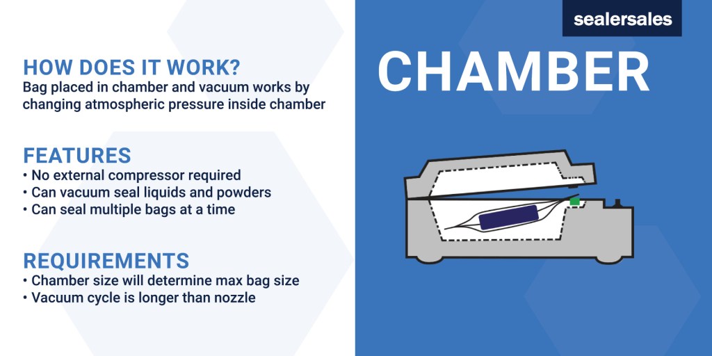 | Chamber Vacuum Sealers In a chamber vacuum sealer, bags are placed in a chamber to initiate the vacuum sealing operation by changing the atmospheric pressure inside the chamber. Chambers can vacuum seal almost any product include liquids and powders. Chambers do not need an external compressor to operate. For a more in-depth explanation on chambers, click here. Features No external compressor required Can vacuum seal liquids and powders Can seal multiple bags at a time Gas flush options available Requirements Chamber size will determine the max bag size Vacuum cycle tends to be longer than in nozzle vacuum sealers |
