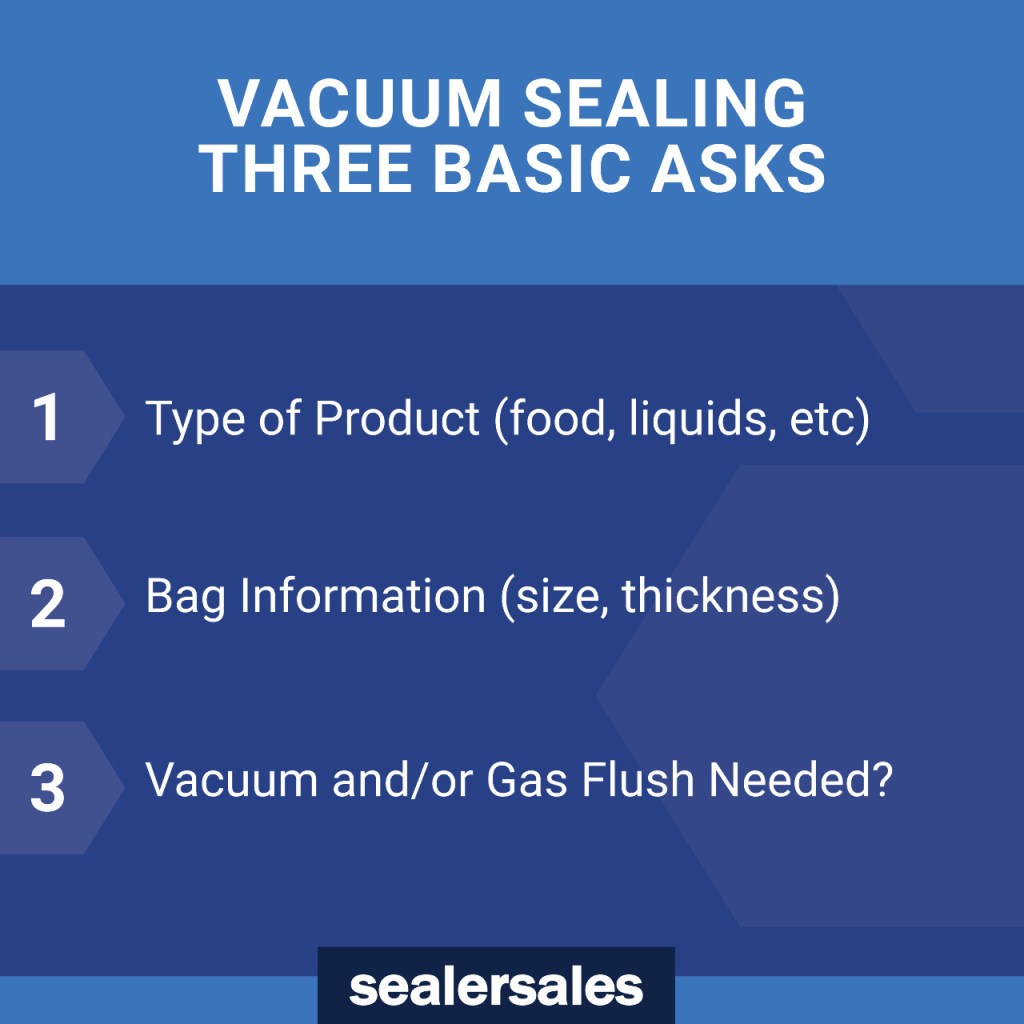 When choosing a vacuum sealer, we will need to know what you are vacuum sealing (food, liquids, electronics, etc) and the type of packaging material you are using (material type, size and thickness). These questions are important to answer to make sure the correct sealer is chosen.